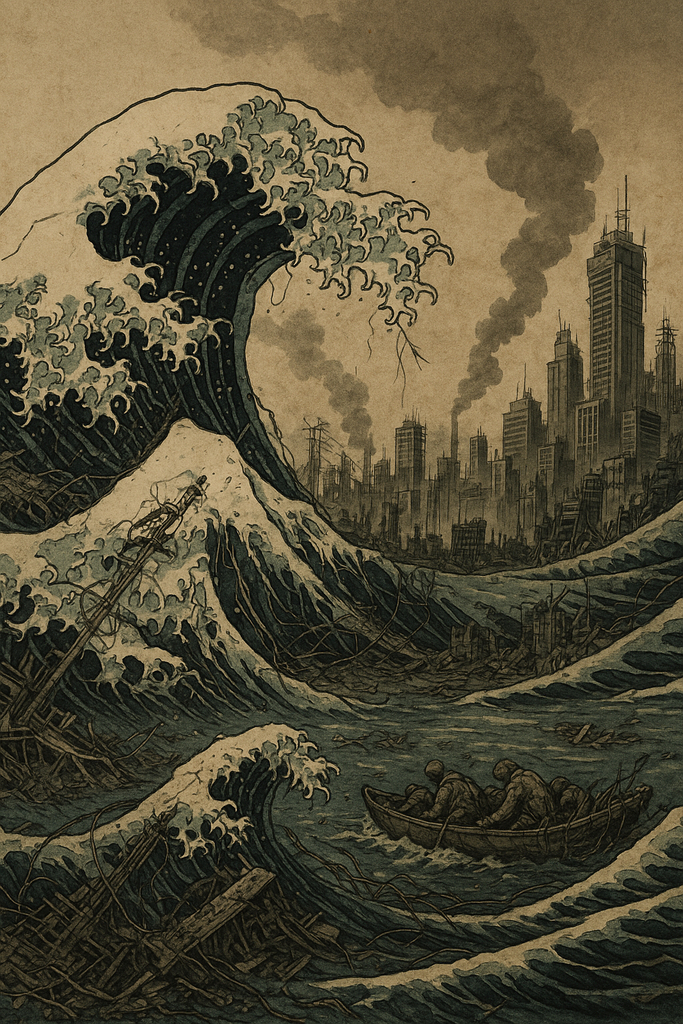 Prompt: “Consider The Great Wave off Kanagawa by Japanese ukiyo-e artist Hokusai, created in late 1831 during the Edo period of Japanese history. I want you to create a dystopian version of it for the XXI century, keeping the aspect and style. Generate it in high resolution so I may use it as wallpaper, please.”